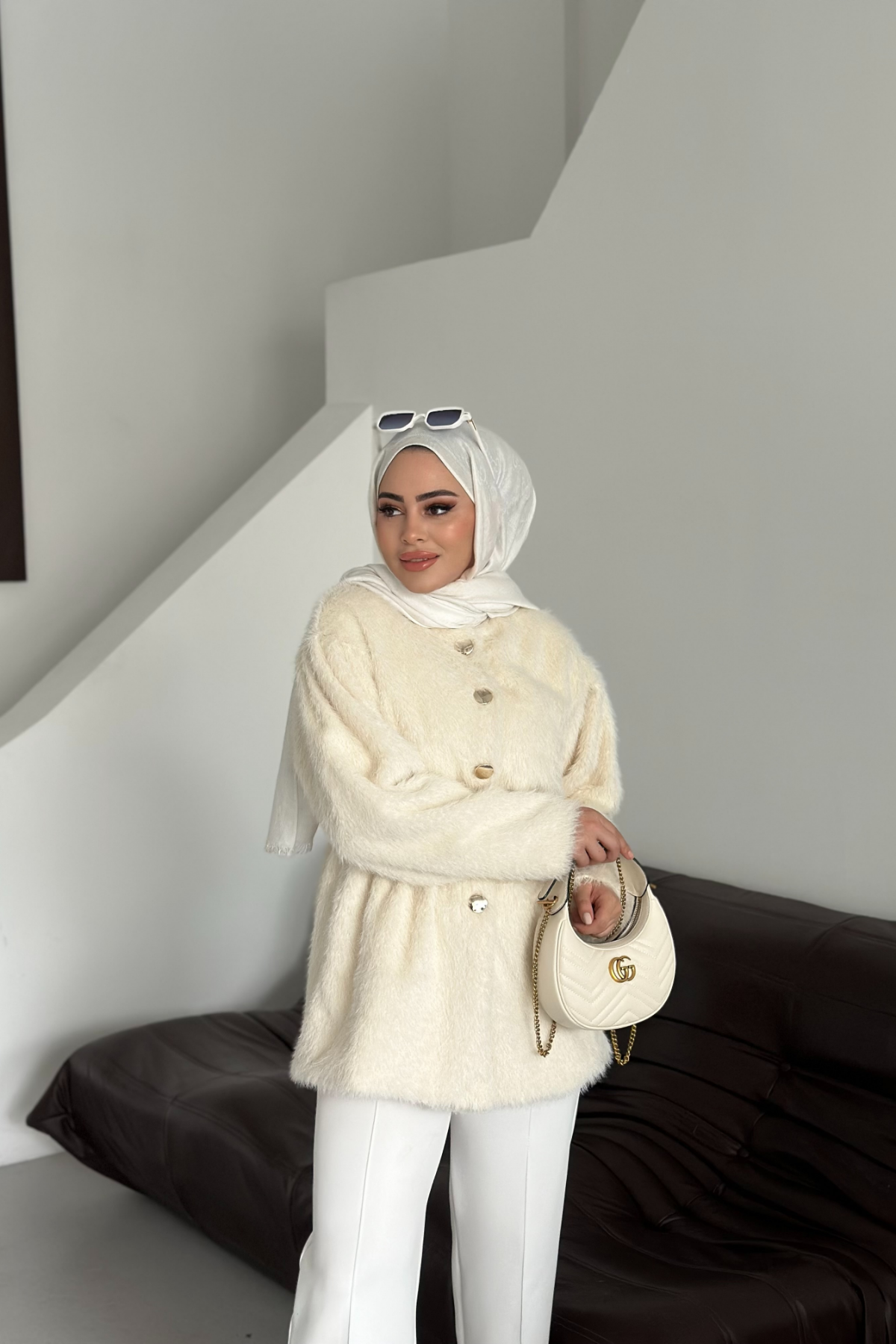 Düğmeli Yün Sakkalı Kaban Ekru (8588)
