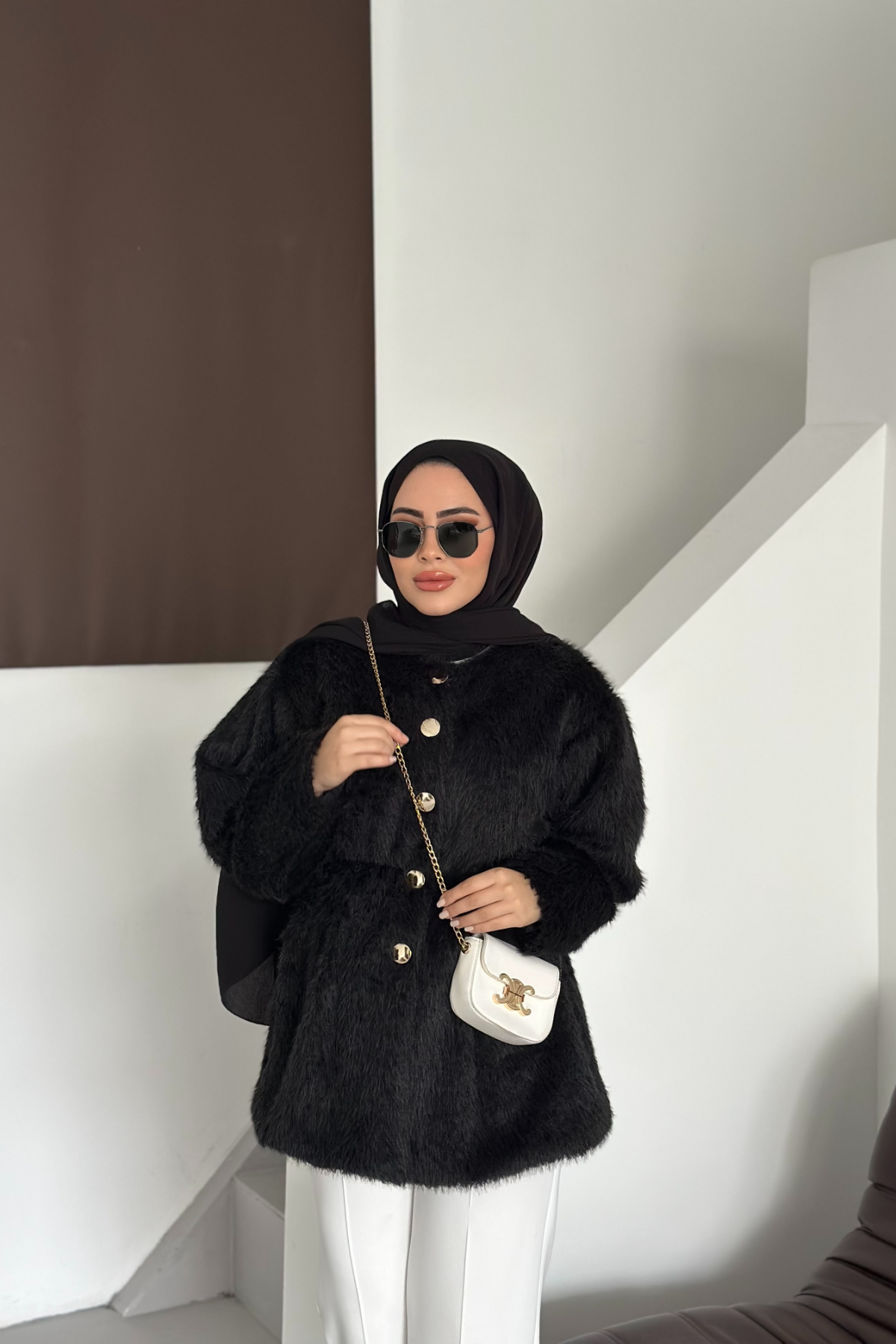 Düğmeli Yün Sakkalı Kaban Siyah
