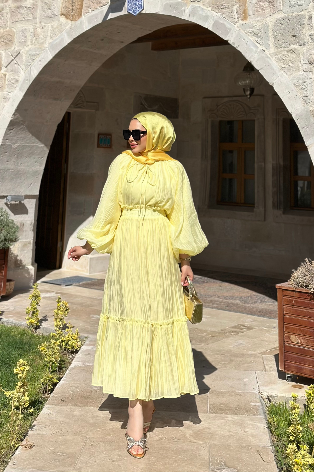 Fırfır Detay Bağlama yakaya sahiptir balon kollu ve kol bilegi lastiklidir içi astarlı iç göstermez.