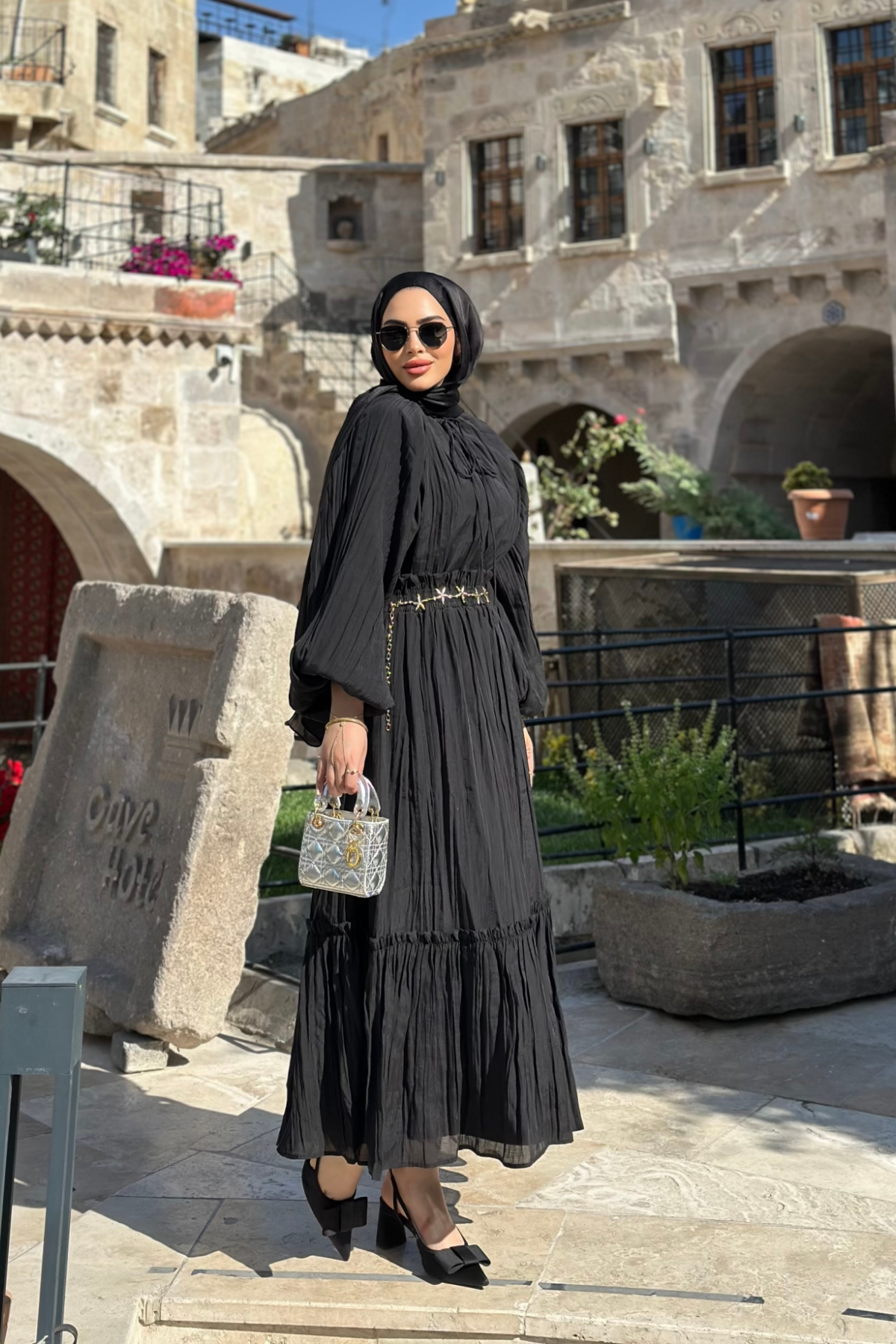 Kraşlı Vual Bağlama Etekli Takım Siyah