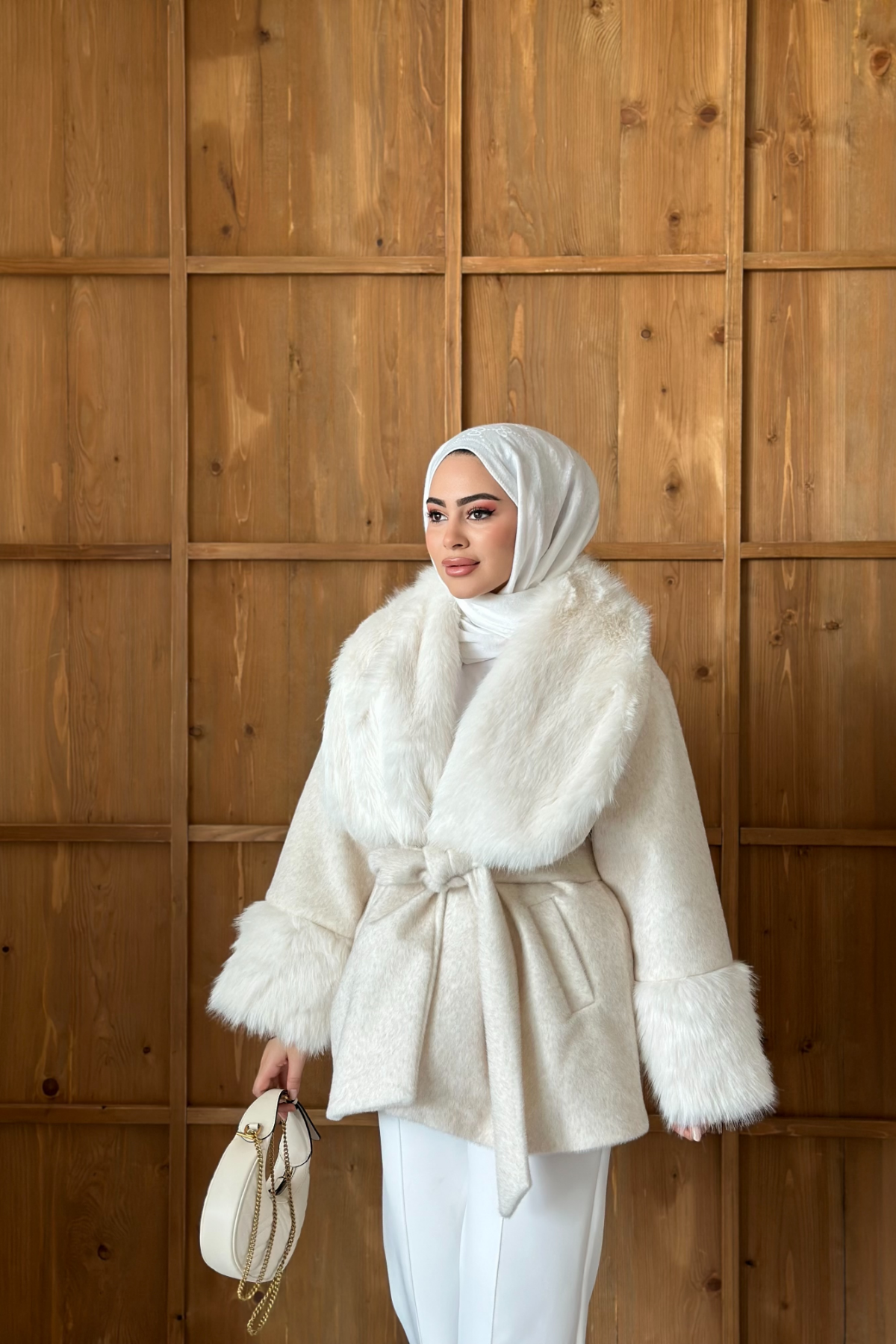 Kol ve yakası kürk detaylı , kullanılabilir çift cepli , içi astarlı , seyyar kuşaklıdır