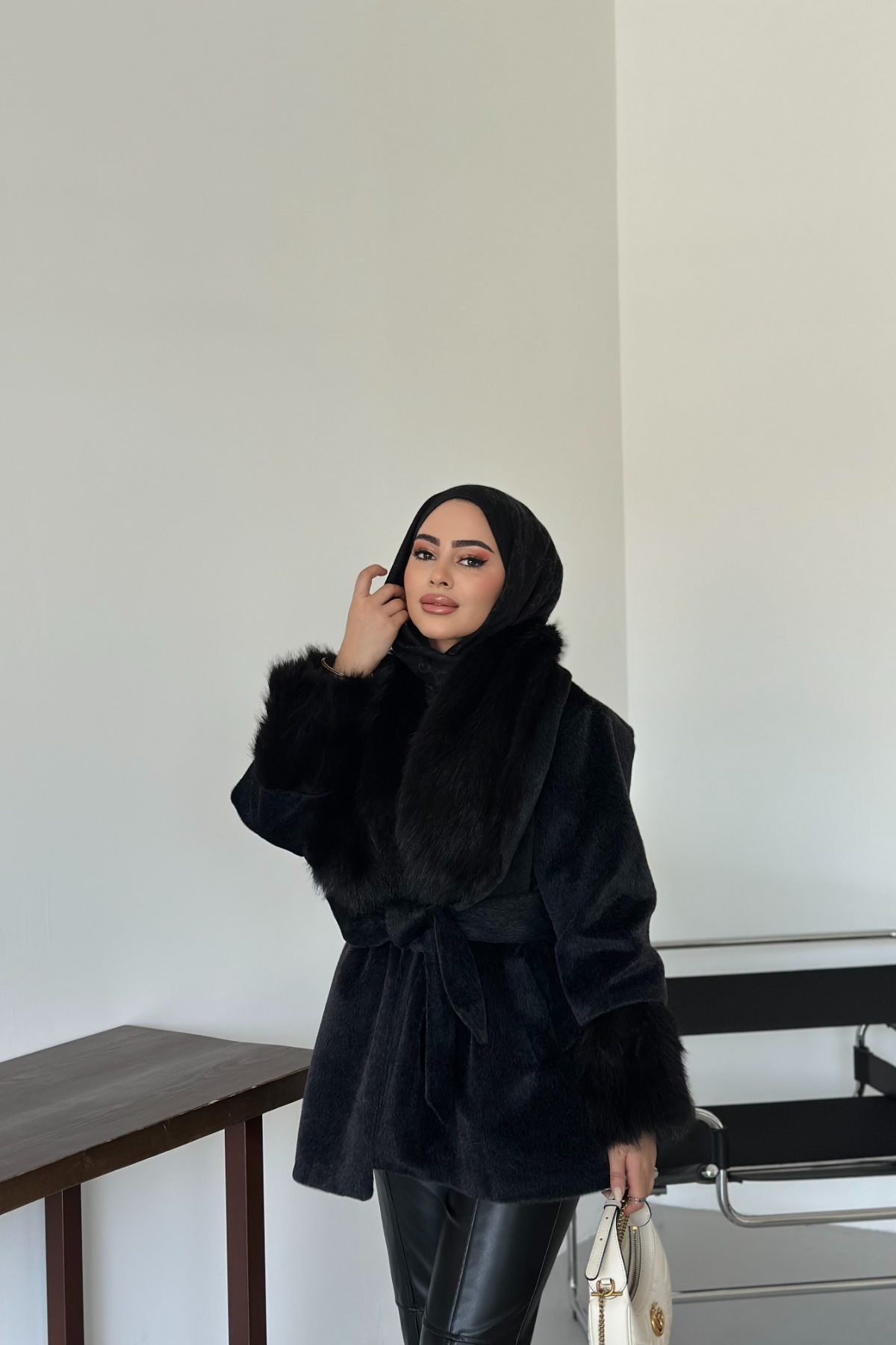 Kol ve yakası kürk detaylı , kullanılabilir çift cepli , içi astarlı , seyyar kuşaklıdır